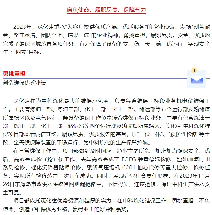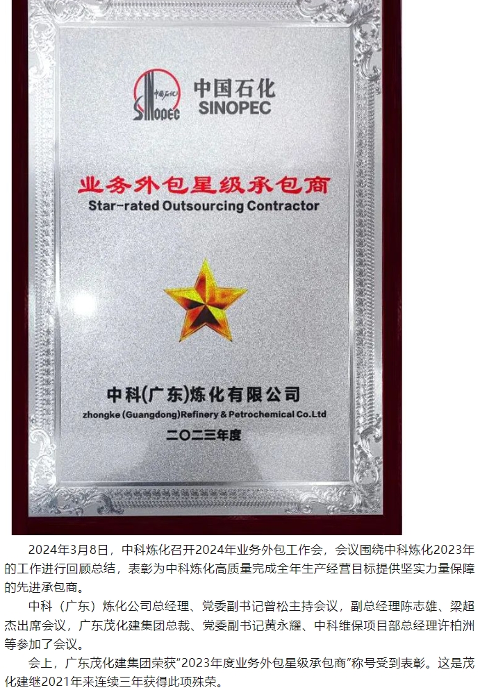 喜報(bào):榮獲中科煉化“2023年度業(yè)務(wù)外包星級(jí)承包商”稱(chēng)號(hào)