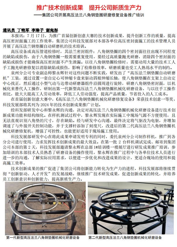 推廣技術(shù)創(chuàng)新成果 提升公司新質(zhì)生產(chǎn)力 ——集團公司開展高壓法蘭八角鋼墊圈研磨修