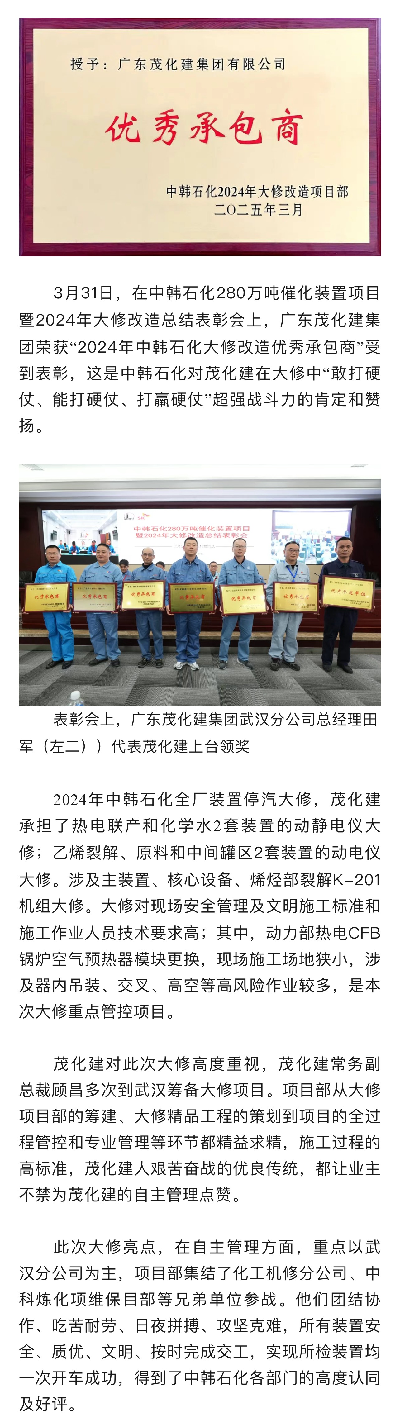 喜報(bào)|榮獲中韓石化2024年大修改造 “優(yōu)秀承包商”稱(chēng)號(hào)